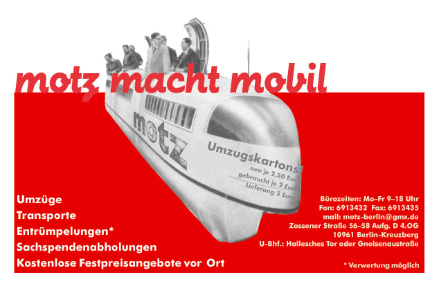 Der gemeinnützige motz & Co…e.V. bietet eine ganze Reihe von Dienstleistungen an und betreibt dazu einige Zweckbetriebe. Diese leisten neben den Sach- und Geldspenden aus der Bevölkerung einen wesentlichen Beitrag zur Finanzierung des Gesamtprojektes mit seinem zum Teil sehr kostenintensiven sozialen Engagement. Zum anderen stellen sie Arbeitsplätze für Menschen zur Verfügung, die aus den unterschiedlichsten Gründen auf dem „normalen“ Arbeitsmarkt keine oder nur sehr schlechte Chancen haben. Alle Arbeitsplätze im Bereich des Vereins sind von den dort Beschäftigten in Selbsthilfe aus eigener Kraft und ohne staatliche finanzielle Unterstützung geschaffen worden. |